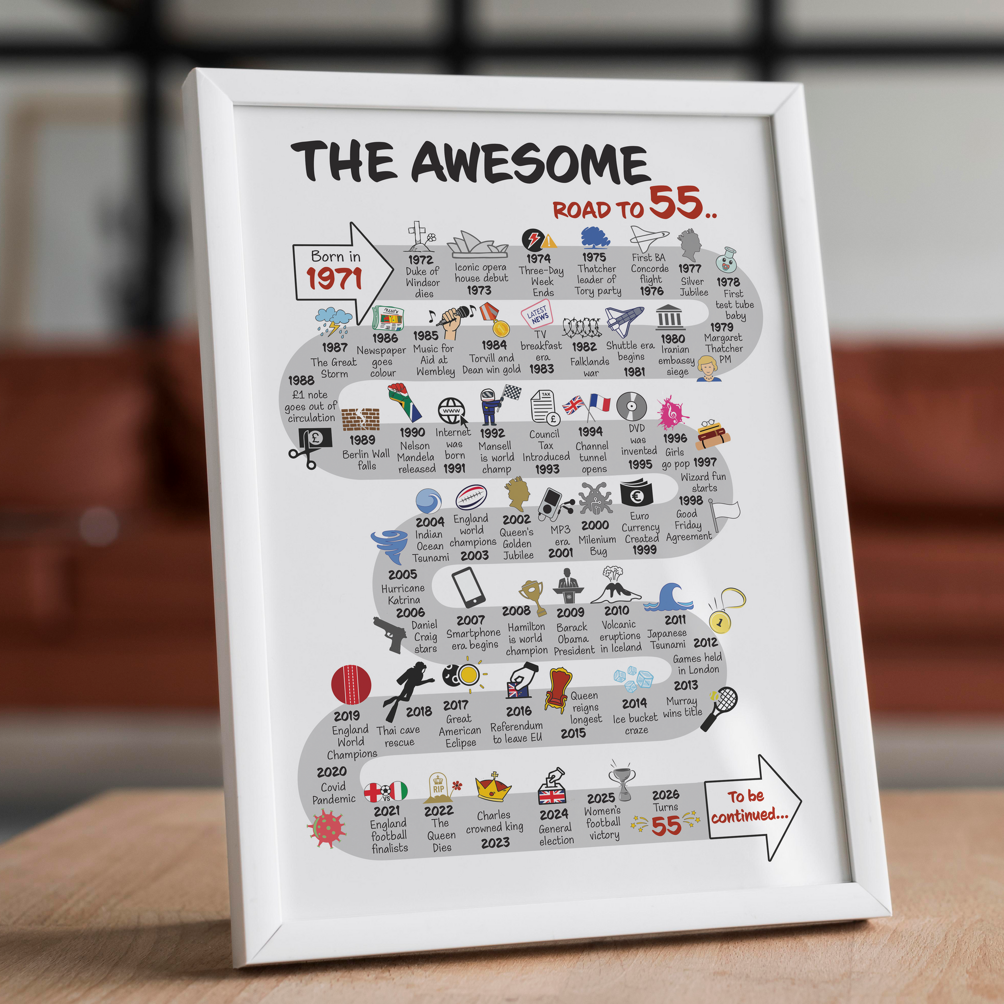 This beautiful print showcases significant global and UK events from the past 55 years.