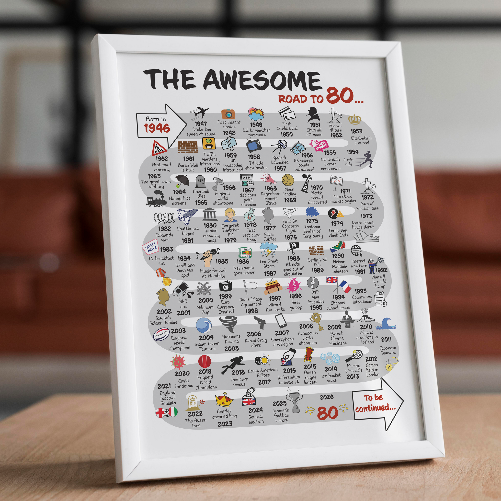 This beautiful print showcases significant global and UK events from the past 80 years.